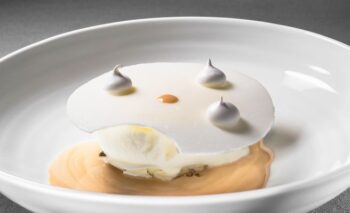 Pas de homard à la carte, mais des creusets, des féras, des ombles chevaliers. Les expériences gustatives et olfactives se succèdent, pour former un tout harmonieux. Avec délicatesse, elles jouent successivement de tous les registres : sucré-salé, amertume acidité, croquant-liquide, chaud-froid… mettant en éveil les 5 sens. Quelques exemples de mets qui font la renommée de La Bouitte : l’Escalope de foie gras sur galette de maïs, miel d’acacias, chapelure végétale, réduit de vieux vinaigre ; la Noix de Saint Jacques, colorées au beurre déshydraté, pousses d’épinards, feuilles d’oseille, bouillon moussé au lard demi-sel ; l’Omble chevalier de nos lacs savoyards, cuit en beurre noisette, carottes anciennes habillées ; les Ris de veau caramélisé, pommes de terre Agria, cigarette russe au Raifort, fumée de chêne ; le Pigeonneau rôti, cuisse confite frottée aux dragées, oignon roussi… Mais le plat qui a fait décoller René et Maxime Meilleur est sans doute “Le lait dans tous ses états” un dessert blanc immaculé rappelant la neige enveloppant le chalet de La Bouitte. Il se compose d’une déclinaison autour du lait – biscuit vapeur, tuile givrée, espuma, glace au lait, confiture de lait, meringue suisse à la poudre de lait. Il n’a jamais quitté la carte depuis sa création en 2010.