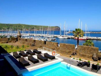 Lové au sein d’une forteresse du 16e siècle, faisant face à la baie de Horta, la Pousada da Horta, Forte de Santa Cruz est un hôtel de charme classé monument national ouvert depuis 2004. Cet établissement affiche une décoration classique. Les 28 confortables chambres et deux suites regardent l’île du Pico ou la célèbre Marina. Elles sont équipées d’une télévision LCD par câble, d’un minibar, de la climatisation et disposent pour la plupart d’un balcon avec vue sur la mer. Profitez pour faire halte dans l’excellent restaurant régional avec vue sur la piscine. On peut y savourer des spécialités comme le croquant de rillons sur tranche d’ananas, le pavé de thon au four, viande en sauce à la mode de Faial, la noix de bœuf de la Terceira… Adresse : Rua Vasco da Gama 9900-017 Horta, tél. +351 292 202 200. Site web : www.pousadas.pt