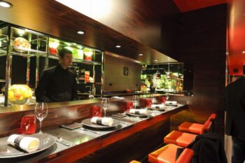 Pour arriver dans ce temple de la gastronomie, il faut emprunter escalier… quelques places assises version lounge permettent de faire patienter les clients. Ici, il n’y a que 40 sièges si l’on souhaite prendre place autour du comptoir. Dans une salle adjacente (et privatisable), 15 places viennent s’y ajouter. Joël Robuchon, le regretté Chef aux 26 étoiles, présent à Monaco, Paris, Londres, New York, Las Vegas, Tokyo, Hong-kong, Singapour, Macao ou Taipei présente ici une gastronomie à l’esprit français avec une touche qui rappelle l’ambiance de bars à sushis et de comptoirs à tapas. Sur cet Atelier il a confié le piano à Yosuke Suga, qui a participé aux ouvertures des Ateliers de Tokyo, New York et Taipei. On retrouve également les complices de Joël Robuchon ; Philippe Braun, Antoine Hernandez, Eric Bouchenoire, Eric Lecerf, François Benot, Guy Job et Axel Manes. Philippe Braun indique “dans ce lieu à la différence de l’Atelier Montalembert, nous proposons un menu brochettes – légumes, viande, crustacés façon yakitori, à la française… les chefs s’expriment différemment mais la qualité reste la priorité essentielle”.