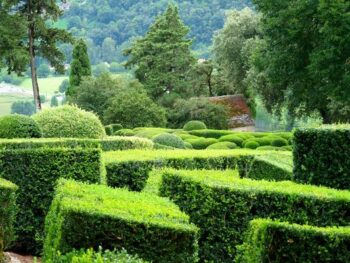 Depuis bien longtemps, Marqueyssac fascine pour son romantisme. En 1692, Bertrand Vernet, architecte et conseiller du roi, acquiert l’endroit. Un élégant château de plaisance, couvert de lauze grise, y est bâti à la fin du XVIIIe siècle. Un certain Julien de Lavergne de Cerval, magistrat à Sarlat, hérite du domaine en 1861. Passionné par l’art des jardins, amoureux de l’Italie, il consacre trente années de sa vie à embellir sa propriété. Il plante des milliers de buis, des arbustes qui s’adaptent particulièrement bien sur les sols calcaires, aménage 22 hectares de jardins, agrémentés de belvédères, rocailles, cascades et théâtre de verdure… Les allées dessinent 6 kilomètres de promenades. Abandonnée au XXe siècle, cette folie verte a retrouvé sa féerie et son cachet italianisant grâce à Kléber Rossillon, un autre amoureux du patrimoine. Marqueyssac compte 150.000 buis centenaires entretenus par des jardiniers et experts dans l’art topiaire. Ils leur donnent des formes complexes. L’avantage avec ces plantes, c’est qu’elles restent vertes toute l’année. Et avec 200.000 visiteurs par an, les équipes ne doivent rien laisser au hasard.