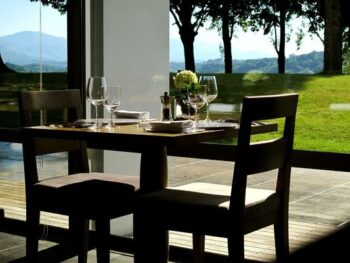 Côté façade ouest et restaurant, place à la note contemporaine. La grange-bar à l’atmosphère chaleureuse concourt pleinement au grand confort qui caractérise cette demeure. L’habile rénovation porte la griffe de l’architecte tandis que la décoration impeccable signée Flamant contribue à la mise en valeur des éléments les plus anciens de l’édifice. Le tout s’ouvre sur la nature, les montagnes et la Vallée de la Nivelle. Ici, on trouve des tables en chêne clair dessinées par Isabelle Juy (Flamant) pour L’Auberge, des lustres en verre de Flamant, des assiettes d’accompagnement créées spécialement par les céramistes Cazaux de Biarritz, des serviettes en toile basque des tissages Ona Tiss, des porcelaines Bernardaud et des verres et carafes Jean-Pierre Lagneau.