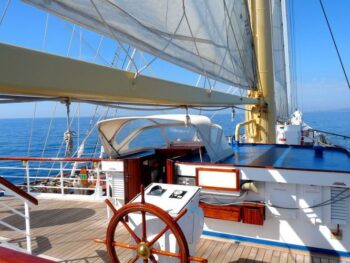 Le Star Flyer (115 m de long), avec ses 85 cabines doubles, attire les croisiéristes qui apprécient le confort, les traditions et le charme légendaire de la marine à voile. Dès l’embarquement à Cannes, on découvre un décor classique et raffiné qui invite à la décontraction. On rejoint notre spacieuse cabine où le teck est roi. Elle est meublée de manière confortable et moderne. Comme les 170 passagers présents, on constate que la vie à bord est placée sous le signe de la détente, à l’instar d’un yacht privé. Par cette belle journée, les ponts sont propices au farniente. En fait, le Star Flyer présente davantage d’espace par passager que la plupart des bateaux de croisière conventionnels. Ici, point de discothèque, ni de casino mais bien autre chose… Tandis que la baie de Cannes s’illumine sous un ciel étoilé, à 22 h précises, l’agitation gagne le pont. Les murmures s’amplifient. Le commandant s’apprête à donner le signal du départ. Les voiles en dacron, un tissu particulièrement résistant au vent sont hissées manuellement en quelques dizaines de minutes avec beaucoup de matelots, mais aussi beaucoup plus rapidement qu’avec le système électronique indique un officier. Tout à coup, venue de nulle part, une musique se laisse d’abord deviner puis enfle. C’est celle de Vangelis, bande originale du film “1492, Christophe Colomb”. L’émotion est palpable, enveloppante… Doucement, on vogue sur la Méditerranée pour rejoindre Calvi, en Corse, notre prochaine escale. Une légère brise nous accompagne. Notre voilier file…grâce à ces mâts de 19 m de haut et à la surface de ses voiles de 3365m2… il est aussi rapide que le vent et majestueux comme un signe. Le Star Flyer est muni d’un système de stabilisateur anti-roulis original : deux réservoirs reliés entre eux qui recueillent les masses d’eau déplacées d’un côté à l’autre par des mouvements du bateau, assurant ainsi une plus grande stabilité. Ce qui n’est pas inutile lorsque l’on file jusqu’à 18 nœuds.