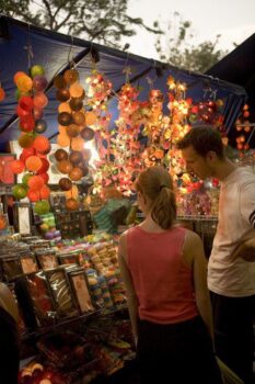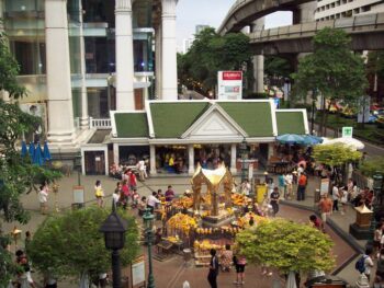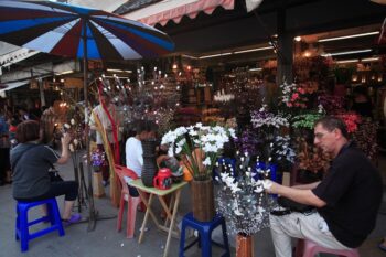 Dans de nombreux endroits de la ville, on rencontre des marchands et vendeurs de rues poussant leurs charrettes ou leurs carrioles, empaquetant et vendant toutes sortes de marchandises. Cet immense et interminable marché propose aux flâneurs toutes sortes de productions et de fins objets, depuis les vêtements les plus élégants et les objets faits main, jusqu’aux petites gourmandises et amuse-bouche aux herbes odorantes, confectionnés devant vous, en passant par les délicieuses soupes de nouilles, les petites bananes douces et les Khanom au riz gluant. Du marché de productions vivrières de Khlong Toei, à celui du dimanche de Chatuchak, ou du marché aux fleurs de Pat Khlong Talat, animé tôt le matin, jusqu’au marché aux vêtements de Pratunam, les rues de Bangkok vibrent fébrilement de vie de jour comme de nuit. Bangkok avec tous ces lieux d’animations trépidants pique tous nos sens et provoque une certaine fascination. Mais on y trouve également des centres commerciaux très modernes à l’image de ceux de Siam Paragon et Emporium. En fin de journée, on peut profiter du calme d’un hôtel ou lécher les vitrines au marché du soir de Silom.Là tout voyageur est véritablement captivé par l’atmosphère d’une vie nocturne à la fois vibrante et bourdonnante.