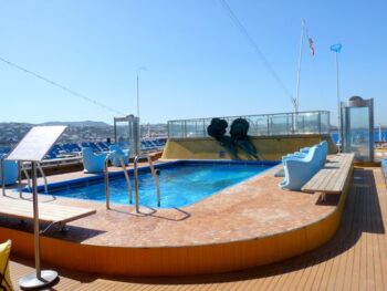 De retour à bord en fin de matinée, on prend plaisir à arpenter les coursives ouvertes sur la mer. Les croisiéristes sont invités à participer à des quizz, à contempler la mer, à se faire dorloter au Spa… Certains se prélassent dans les salons autour d’un verre, d’autres se retrouvent dans l’atrium, au cinéma 4D, au simulateur automobile de Grand Prix, au simulateur de golf avec aire de putting green, à la bibliothèque, dans les boutiques, à l’espace jeux vidéo… Pour ceux qui voyagent en famille, la compagnie Costa a pensé à eux. En effet, une équipe d’animateurs propose aux enfants un espace dédié. En prenant un peu de hauteur, en rejoignant le pont 10, place à la décontraction ou à une séance de farniente près de l’une des piscines et bains bouillonnants.