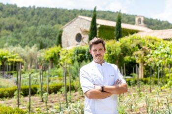 Il revendique une cuisine simple et authentique à l’unisson des produits locaux qui composent sa carte. La devise de la maison, c’est “du potager à l’assiette”. Le chef s’inspire de trois potagers pour nourrir sa créativité. Au menu donc du bio et de l’hyper local. Le guide Michelin a un petit faible pour le Poireau « tête en l’air » avec son velours de citron et sabayon au safran, l’agneau confit en croûte de pain, kumquat et févettes, l’écorce chocolat signé du chef pâtissier Éric Raynal, bourré de talent.