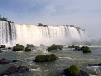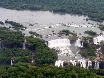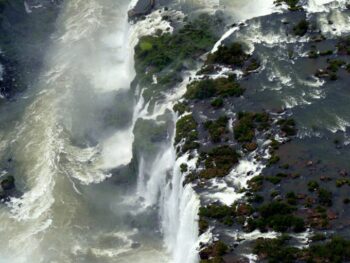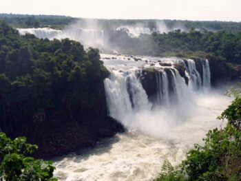 Un gigantesque décor de forêt subtropical encadre les cataractes d’Iguaçu, fleuve qui marque la frontière entre le Brésil et l’Argentine. Le Rio Iguaçu prend sa source au Brésil et parcourt 1300 km avant de se jeter dans le Rio Parana, 23 km en aval des chutes. Le visiteur est séduit par la gorge du Diable, la plus impressionnante. Elle s’effondre au fond d’un canyon d’une telle puissance qu’elle est généralement surmontée par un nuage d’embruns zébrés d’arcs-en-ciel. Ces embruns favorisent la croissance de la végétation luxuriante. La gorge en …forme un fer à cheval large de 80 m, haut de 150 m donne l’impression aux visiteurs que l’eau tombe autour de lui. Le bruit est assourdissant. Les chutes d’Iguaçu comptent parmi les plus puissantes du monde. En fonction du débit de la rivière, le nombre de sauts varie entre 150 à 300 et la hauteur des chutes varie de 40 à 80 mètres, arrivant à 2 700 mètres de large, avec un format semi-circulaire. Le débit d’eau moyen de la rivière est de 1 500 m3 par seconde environ et il varie de 500 m3/s lors des périodes de sécheresse à 6 500 m3/s pendant les périodes de crues.