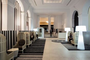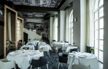 Dès l’entrée de l’hôtel, deux gigantesques colonnes vous transportent dans un univers élégant. Une belle terrasse permet de s’alanguir et de siroter un verre tout en admirant la mer et le ballet des promeneurs sur la promenade Savignac. Les lignes noires et blanches du hall, imaginées par le décorateur Jean-Philippe Nuel, procurent au lieu une silhouette élancée tout en finesse et élégance. Place au bien-être, à la clarté et à la douce tranquillité. Le célèbre architecte à qui l’on doit déjà la renaissance de la piscine Art déco au MGallery Molitor, a privilégié un dialogue entre histoire et modernité. Philippe Nuel, a créé une décoration à l’ambiance balnéaire chic, tenant compte de l’héritage du bâtiment chargé d’histoire. La simplicité des couleurs, les lignes simples de l’espace et du mobilier et les petites touches design envoûtent les sens. A droite du hall, on trouve le bar où l’on peut déguster un exquis tea time et les pâtisseries d’Aymeric Pinard. Le lieu, aux allures de salle de bal, grâce aux hauts plafonds, aux fenêtres gigantesques et à la décoration très inspirée, est baigné d’une lumière chaleureuse. Au fond du bar se situe un grand escalier qui mène au restaurant gastronomique. Pas de doute, vous avez l’impression de voguer sur un somptueux paquebot vers une terre inconnue et enchanteresse.