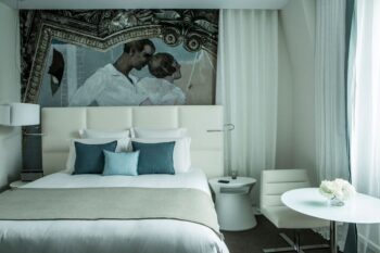 Sur les murs des chambres, à la piscine et dans les couloirs, on admire des reproductions de photographies anciennes invitant à l’évasion et à voyager à travers l’Histoire de cet établissement érigé en 1912. Les chambres respectent l’environnement marin… elles sont décorées par des fresques recomposées à partir d’éléments de décors retrouvés sur le site lors de la rénovation. Elles sont placées au-dessus des lits et offrent une disposition spectaculaire. Au plafond, admirez les lustres en nacre. Ici, tout n’est que finesse et richesse des tissus : laine, lin glacé, mat et satin habillent les fenêtres, canapés et fauteuils. Les rideaux sont pensés comme une partie intégrante de la pièce et non pas comme simple décor. Ils se déploient autour de la chambre et créer un véritable cocon. Dans les salles de bain, on trouve des produits Gemology sans parabène et… certaines chambres possèdent des salles de bain ouvrant directement sur la chambre.