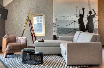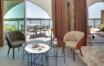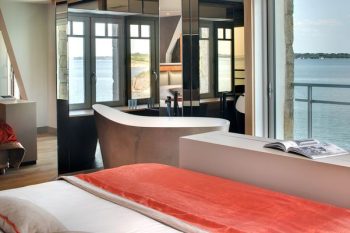 Parmi les chambres les plus prisées de l’établissement, on compte la « Belle de Vilaine » inspirée de la chaloupe à voiles de 1887 qui mouille à Billiers. D’une superficie de 83m2 (+ balcon de 7m2) avec ses deux grandes baies vitrées exposées plein sud sur la mer. A ne pas manquer la chambre « Voyages ». On y accède (au 1er niveau du manoir) par un escalier historique avec des sculptures qui s’enroulent autour d’un mât de navire. En entrant, on a la sensation d’être comme sur un bateau, transporté par l’horizon à travers ses grandes baies. Embrassée par l’océan, cette suite de 83m2 (+ balcon de 7m2) évoque le voyage maritime et la fastueuse période de l’entre-deux guerres.