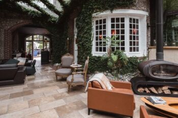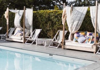 Aux beaux jours, il fait bon siroter un cocktail ou une coupe de champagne au bord de la piscine, à l’abri des regards et du vent. Le long du bassin, de moelleux et lits de repos invitent à une douce sieste. Quant au salon cosy, tout en longueur et en couleurs avec sa cheminée, sa bibliothèque tapissées de livres, ses larges fauteuils clubs rouges ; il permet de belles séances de lecture.