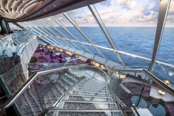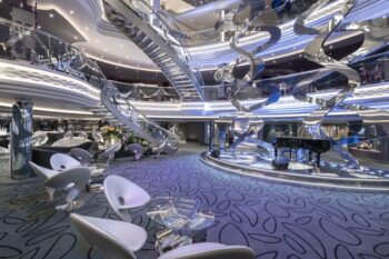 Bienvenue à bord du MSC Bellissima. Les passagers sont logés dans 2217 cabines et suites, des petits studios intérieurs de 12 m² jusqu’aux huit suites en duplex de 59 m² ou aux deux suites royales de 56 m² avec terrasse semi-panoramique, toutes dotées d’un grand salon, une chambre séparée ou encore bain à remous en extérieur. Les espaces intérieurs du MSC Bellissima s’organisent autour d’un splendide atrium, haut de trois ponts et encadré par d’immenses baies vitrées. Des escaliers monumentaux aux marches incrustées de cristaux Swarovski desservent les différents niveaux. Ici, on trouve la réception, le bureau des excursions, la galerie photo, ainsi que plusieurs bars et salons dont le très prisé Champagne Bar. Le paquebot dispose d’une véritable rue intérieure : la Galleria Bellissima. Elle est bordée de boutiques, de restaurants chics, de bars sans oublier un espace spécialités de chocolats, glaces et macarons orchestré par le chef français Jean-Philippe Maury, ainsi qu’un TV Studio & Bar. Au niveau inférieur (pont 6) se trouvent trois des quatre salles à manger principales, le Lighthouse Restaurant sur l’extrême arrière, et avant lui Le Cerisier et Il Ciliegio. Le quatrième Posidonia se trouve sur le pont 5.