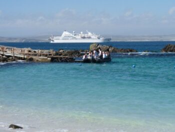 Depuis quelques jours, passagers et officiers du Diamant ont eu le temps de faire connaissance. “Le Diamant, ce n’est pas un palace, mais un navire à taille très humaine et confortable” indique une passagère qui en est à son troisième séjour à bord de ce navire construit en Allemagne en 1974 pour le transport de marchandises, puis transformé en navire de croisière en 1986. L’arrière du Diamant abrite neuf bateaux pneumatiques qui servent de moyen de transport vers les zones les plus reculées ou pour effectuer un débarquement imprévu. Comme tous les passionnés, le commandant cherche à faire partager ses connaissances des mers aux passagers à qui il aime réserver souvent des surprises. Comme dévier le navire de son itinéraire initial pour pouvoir observer de près des baleines, une île peuplée de lions de mer. Cela fait partie de la philosophie de la compagnie du Ponant. Quitte à réveiller les passagers ! Jamais avare de commentaires ni d’explications, le Commandant Marchesseau, “C’est de cette façon que nous faisons plaisir à tous”. Les itinéraires du Diamant font le bonheur des passagers, Anne et son compagnon que nous croisons au détour d’une coursive nous confient : “nous pensions que les navires de croisière ne faisaient escale que dans les grandes villes. Avec le Diamant, nous avons la chance de visiter des endroits peu connus. Et quand nous faisons une croisière d’expédition, la destination n’est plus une ville ou une île mais la faune marine”.