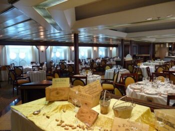 La gastronomie française occupe naturellement une place de choix. Chaque repas est source de découvertes, grâce au talent incontestable et à l’imagination fertile du chef cuisinier et de sa brigade. D’ordinaire, sur les paquebots, les menus sont préétablis à l’avance et ils demeurent les mêmes d’une semaine à l’autre. La Compagnie du Ponant, elle, donne une grande liberté de création à son chef. Une vingtaine de serveurs officient avec maestria dans les deux restaurants du Diamant, l’un de 190 couverts “Iles de France” et le second “L’Escapade ” de 40 couverts avec vue imprenable sur la mer. Par ailleurs, lorsque la météo le permet, les déjeuners ont lieu en plein sur le pont arrière près de la piscine. La formule buffet est à l’honneur le midi, avec des plats préparés à partir des produits frais et locaux le plus souvent possible. Le soir venu, le choix porte entre deux entrées, trois plats principaux et deux desserts du menu principal, ou encore quelques plats du menu allégé, le tout copieusement arrosé de vins judicieusement sélectionnés en fonction des plats. La tradition est pleinement respectée à bord du Diamant – et plutôt deux fois qu’une -, avec l’organisation de deux repas de gala du commandant qui sont le prétexte à offrir aux passagers des menus festifs encore plus élaborés. Plaisirs de la table, service attentif et prévenant, contacts personnalisés sous la houlette d’un commandant omniprésent pour le plus grand plaisir des passagers, des destinations et des escales exotiques, voilà la recette concoctée par la Compagnie du Ponant.