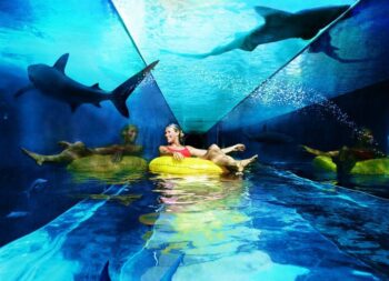 Le grand parc aquatique de L’Atlantis, s’étend sur 17 hectares avec une rivière de 2 km qui en boucle parcourent l’espace de loisirs et ses cascades. Les amateurs de sensations fortes peuvent dévaler 27 mètres en 6 secondes sur un toboggan aquatique depuis le sommet d’une grande pyramide de style mésopotamien, installée au milieu du parc d’attractions. L’arrivée se fait au milieu des requins ! On compte aussi une “Dolphin bay” qui accueille 28 dauphins. Site web : www.atlantisthepalm.com