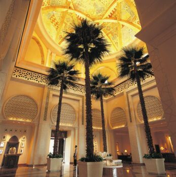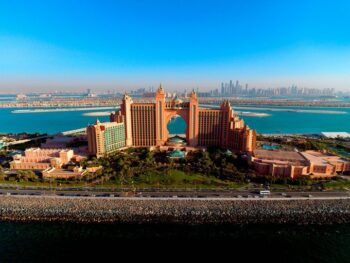 Dubaï comptait le Burj al-Arab, l’un des hôtels les plus luxueux au monde qui se dresse comme une voile étarquée en bord de mer. Aujourd’hui, l’autre symbole, c’est le gigantesque complexe hôtelier inspiré du mythe de l’Atlantide et ses 1.539 chambres développé par la société Kerzner International. Atlantis, tout en rose, symbolise une citadelle géante érigée aux portes de Jumeïrah sur The Palm. Les chambres les plus luxueuses donnent directement sur un aquarium géant, où 65.000 espèces marines cohabitent dans 11 millions de litres d’eau pompés dans le Golfe. L’hôtel est divisé en deux tours (Est et Ouest) reliées par un long pont au 22ème étage. La sculpture placée au centre de l’immense réception en cercle est constituée de plus de 3 000 pièces de verre assemblées… un chef d’œuvre signé Dale Chilhuly. Dans la grande galerie, on trouve plus de 25 boutiques de grandes marques et le fascinant Ambassador Lagoon et ses poissons qui mérite un détour. Dans l’hôtel, les Lost Chambers sont conçues tel un labyrinthe dédié au mythe de l’Atlantide et à la vie marine côtoyant les ruines de la cité engloutie. La décoration y est très futuriste et assez kitsch.