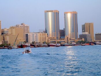 Dès 1991, on commence à parler de Dubaï sur la scène internationale. Une vaste voie rapide, Cheikh Zayed Road traverse sur plus de 30 km la ville. De part et d’autre s’alignent des gratte-ciels aux formes étranges, parfois fantaisistes, inspirées parfois de châteaux gothiques. On se croirait presque dans une ville virtuelle… Revenons à Dubaï Creek et à ses proches quartiers. Certes si le quartier Dubaï Creek respire l’histoire, sur les deux rives de la Creek, on retrouve un tissu urbain arabe traditionnel avec des souks, des ruelles et des mosquées. Pour notre plaisir, le paysage compte beaucoup de boutres, ces embarcations en bois qui assurent le transport de marchandises avec l’Iran. Dubaï a toujours profité de sa position géographique comme lien commercial entre la Perse, la péninsule arabique et l’Inde. Il s’en dégage une certaine magie rappelant à la fois Istanbul, Venise ou Bangkok bien que l’on compte aussi des façades ultramodernes.