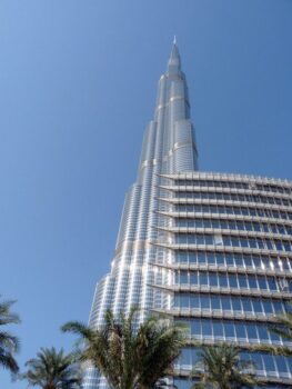 Avec ses 828 mètres, la tour Burj Khalifa est la plus haute tour du monde. Construite au cœur d’un nouveau quartier Downtown Burj Khalifa a été inaugurée en janvier 2010. Ce gratte-ciel gigantesque comporte 160 étages et comprend un hôtel de luxe Armani, des appartements et des bureaux. Nouveau symbole de la démesure de Dubaï, elle se distingue par sa flèche gigantesque. Le bâtiment, visible 100 km à la ronde, est fait de béton et de barres de fer. Les travaux, commencés en 2004, se sont achevés en 2009. Au plus fort de sa construction, 12 000 ouvriers, venus de toute la planète, travaillaient sur le chantier. Le design de Burj Khalifa est signé par le cabinet américain SOM pour Skidmore, Owings et Merrill. Son concepteur principal Adrian Smith s’est inspiré d’une plante uniquement cultivée à Dubaï et en Inde : le Hymenocallis. Quasiment jusqu’à la fin des travaux, la plus haute tour du monde s’est appelée Burj Dubaï. Le 21 juillet 2007, elle arrache le titre de plus haut gratte-ciel du monde en dépassant la tour Taipei 101 (mesurant seulement 555 mètres). Le 17 janvier 2009, le sommet de Burj Khalifa est achevé, l’édifice atteint alros sa hauteur définitive, soit 828 m.