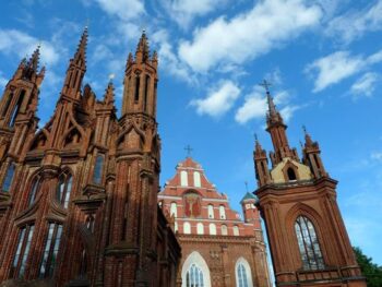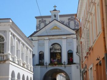 La cathédrale toute blanche -édifiée en 1251 et agrandie au fil des siècles- abrite sur son fronton les imposantes statues de Sainte- Hélène, Saint- Stanislas et Saint-Casimir. A quelques mètres de là, la majestueuse tour de la cloche, blanche, ronde, élancée, semble surveiller la place. Les églises sont partout. Grandes orgues, recueillement, prêche… Saint-Casimir, patron de la Lituanie, a, bien sûr, droit à son église, exemple remarquable du style baroque. Sa splendide coupole, coiffée par la couronne des princes lituaniens, domine le panorama de la vieille ville. A deux pas, le château de Gédiminas, tout en brique -datant du 14e siècle- offre de son sommet un beau panorama des sur Vilnius. Les aléas de l’histoire de Saint-Casimir sont un peu à l’image de ceux qu’a eu à subir le pays : deux fois détruites au XVIII ème siècle, l’église sera transformée en grenier à blé par les armées françaises en 1812, qui en profiteront d’ailleurs pour détruire fresques, autels et statues. Et les décennies suivantes apporteront aussi leurs lots de dévastations. Pendant l’occupation soviétique, ces derniers, transformeront même l’église en musée… de l’athéisme. Outre les châteaux, la ville historique regorge de monuments à visiter tels que la porte Mdininkai, l’hôtel de ville et un grand nombre d’édifices religieux, églises, monastères et synagogues très bien conservés.