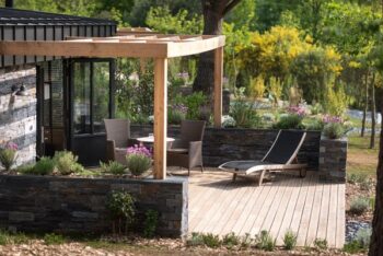 Le domaine égraine donc un art de vivre tourné vers la nature. Au cœur des vastes prairies fleuries se dresse un bâtiment, tout en angles droits. Le toit également couvert d’herbes sauvages adoucit la rigueur contemporaine de l’édifice et permet de réguler naturellement la température. À l’intérieur, les matériaux affichent sans fard leurs couleurs locales. Bois de Brocéliande, granit du Morbihan, schiste breton, le décor épuré joue la carte du rustique chic. Salons, couloirs, chambres, dotées de larges baies, offrent un panorama apaisant. Au bout du jardin, une cabane suspendue à six mètres du sol invite les plus naturophiles à un tête-à-tête insolite avec les arbres. L’hôtel est certifié Green Globe.