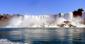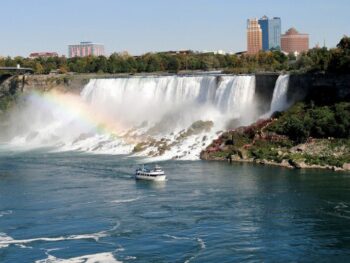 Tout autour de ce fabuleux spectacle naturel, une immense cité s’est construite depuis la fin du 19ème siècle. Si l’on peut parfois en déplorer l’aspect mini Las Vegas, il est par contre tout à fait possible de s’en affranchir, voire même de l’oublier face à la beauté du lieu. Par ailleurs de nombreuses attractions, en relation avec les chutes, complètent au contraire et bien agréablement l’excursion. A ne pas manquer, la mini croisière de 30 minutes environ sur le Maid of the Mist. Revêtus d’un poncho bleu, gracieusement offert et qui vous donne un petit air de Schtroumpf, vous embarquez sur un bateau qui vous emmène au pied des chutes du fer à cheval, à portée de main des trombes d’eau. Vous êtes au coeur de la beauté, de la puissance, du vacarme, des goutelettes, bref…des chutes ! Sensations garanties, en toute sécurité bien sûr, et la certitude de retrouver terre émerveillé et… mouillé ! Toujours pour apprécier les chutes au plus près, la promenade “Journey behind the falls” se révèle également impressionnante. Grâce à un ascenseur qui vous descend à 150 mètres dans l’assise rocheuse, vous rejoignez couloirs et belvédères qui conduisent à des observatoires juste derrière ou au pied même des chutes.