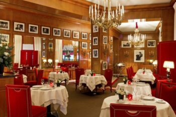 Boiseries blondes, lustres dorés, fauteuils de velours rouge cloutés… Dans un décor classique de traditionnelle brasserie parisienne, le Fouquet’s affiche fièrement son lien éternel avec les arts et le cinéma. Des plaques en laiton indiquent les tables préférées d’artistes comme Edith Piaf, Jean Gabin, Charles Aznavour tandis que des portraits de célébrités immortalisées par les studios Harcourt décorent ce lieu d’exception. D’ailleurs depuis 1990 le Fouquet’s est inscrit à l’inventaire des Monuments Historiques… il est ainsi officiellement consacré haut lieu de la culture française. Au Fouquet’s, le luxe n’est pas dans l’apparence mais dans la vérité et l’attention. A ce titre, les habitués retrouvent sur leur table préférée, à chacune de leur visite, un rond de serviette en argent gravé à leur nom… comme à la maison. Pour les beaux jours, la brasserie se prolonge sur la terrasse avenue George V – autrefois appelée La Plage, en référence aux passants flânant sur l’avenue comme sur les planches de Deauville.