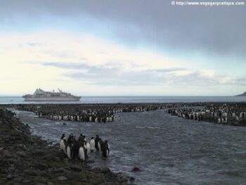 Après le déjeuner, c’est presque un rite, c’est l’heure du briefing pour tous. Les règles de sécurité et consignes spécifiques aux débarquements de la journée sont passées en revue conformément aux normes IAATO -International Association of Antarctica Tours Operators- qui visent à participer à la préservation et à la protection de l’environnement de ces territoires par un comportement responsable des visiteurs. Tout est prévu et notamment des séances de cours magistraux, assurés par les meilleurs spécialistes et dispensés dans le confort du Grand salon du Diamant. L’arrivée sur la baie de Saint Andrews révèle une vraie surprise. La rencontre avec une incroyable colonie de manchots royaux de plus 200 000 individus… Aussitôt, les canots pneumatiques mis à l’eau, on nous ” beache ” à terre. Nous mettons alors le pied sur l’une des plus belles région et plus authentique destination courue de la planète.