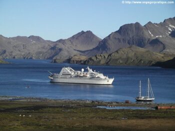 La côte orientale est découpée en baies, fjords et glaciers. C’est une réserve naturelle et l’autorisation des Explorations Polaires Britanniques est indispensable pour y accéder. Toute la faune du grand Sud attend le voyageur : albatros hurleurs et fuligineux, pétrels, manchots papous et royaux, éléphants de mer, otaries… Le Diamant atteint la Géorgie du Sud par les îles Willis. Les vents y sont souvent violents mais la banquise n’enserre qu’exceptionnellement l’ île. Grytviken, station baleinière qui fonctionna de 1904 à 1965 est notre première rencontre avec l’aventurier Shackleton qui est décédé ici même terrassé par une crise cardiaque le 5 janvier 1922. Il était arrivé la veille avec l’équipage du “Quest”.