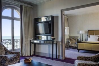 Rénové par le Studio Marc Hertrich et Nicolas Adnet, l’établissement, a rejoint, la collection MGallery -sélection d’établissements haut de gamme, remarquables par leur identité. Lors de la réhabilitation du Grand Hôtel, l’objectif était de réinscrire le bâtiment centenaire dans notre époque, tout en respectant son histoire. Le dosage entre éléments contemporains et éléments de style a su traduire une vision nouvelle du charme, de la poésie et de l’élégance qui caractérise Cabourg. La bâtisse néo-italienne a fortement inspirés les architectes d’intérieur pour donner un nouveau souffle à l’établissement. Pari réussi. Les miroirs et grandes baies vitrées apportent une belle luminosité et offrent une vue plongeante sur la mer. La grande hauteur sous plafond, les larges couloirs et les vastes chambres contribuent au style majestueux de l’hôtel. Des pièces maîtresses telles que les lustres monumentaux confèrent aux lieux une élégance hors du temps. Les espaces centenaires ont été modernisés par un mariage subtil de matières, de couleurs et de mobilier. Les coloris associent avec délicatesse les tons modernes ; gris, bleu, chocolat, prune, violine et mauve, aux plus classiques dorés et beiges. Les matériaux nobles donnent aux lieux une dimension authentique. Là aussi, place à la tradition : bois, cuir, stuc, et modernité : verre, inox, se marient à merveille. Les tissus et les imprimés ont été sélectionnés avec soin ; les velours et taffetas cossus se mêlent à la légèreté des voiles et cotons aériens.