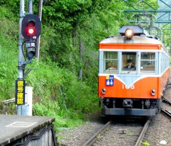 Rappelons que la région d’Hakone côtoie le cratère effondré d’un volcan, une caldeira dont le lac occupe l’endroit le plus bas. Lors de la dernière éruption qui remonte a 3000 ans, le lac d’Ashinoko et la vallée d’Owakudani ont été formées. Un sentier permet d’observer les flancs dénudés et rocailleux du volcan Kamiyama d’où émanent les fumerolles. Les boutiques vendent des oeufs noirs – kurotamago au goût de soufre- , cuits par la géothermie. Ensuite, place à un second téléphérique pour rejoindre en une dizaine de minutes de descente Sounzan. De là, un funiculaire conduit jusqu’à Gora et sa gare. On embarque alors, à bord du sympathique train Hakone-Tozan qui sillonne la montagne jusqu’au point de retour, Hakone-Yûmoto. Cette ligne remonte le long de la montagne en changeant de sens à 3 reprises !