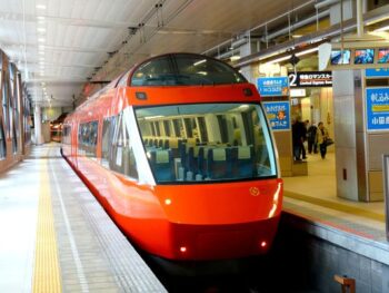 Le Romance Car est un train très confortable et climatisé. Les voitures sont organisées en 2 rangées de deux sièges que l’on peut tourner à volonté pour former, par exemple, un carré de 4 sièges se faisant face. A bord, une hôtesse propose un service de boissons froides ou chaudes ainsi que des pâtisseries. Une fois arrivé à Yûmoto, la découverte de la région d’Hakone peut débuter. Il est captivant d’utiliser plusieurs moyens de transport. Généralement, on prend un bus qui sillonne la montagne vers Moto-Hakone-Ko. On découvre le lac Ashi (Ashinoko) via différents moyens de transport : train, bus, bateau, funiculaire et téléphérique. Pour naviguer sur le lac Ashi, plusieurs possibilités s’offrent à vous. On peut réaliser une promenade sur le lac sur des embarcations originales : un galion, des bateaux cygnes, un bus amphibie… Pour les plus sportifs, une petite virée en pédalo ou en canoë s’impose. A deux pas, ne manquez pas Hakone-jinja, un sanctuaire dans la forêt, au cadre très agréable avec son grand Torii qui donne sur Ashinoko sans oublier l’avenue des cèdres anciens -l’arbre de la région qui se retrouve d’ailleurs sculpté dans pas mal de boutiques du coin.