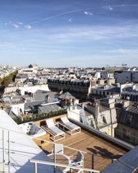 Pour vivre l’expérience du Paris magique, l’Hôtel Bowmann vous invite à découvrir sa Suite. On se retrouve sur les toits via un ascenseur privatif. Là, on admire une terrasse à l’infini avec jacuzzi pour rêver et Paris en panoramique dévoile ses plus beaux monuments : le Sacré-Coeur au loin, le dôme de l’église Saint-Augustin resplendissant, les toits de l’Opéra Garnier, la Tour Eiffel… Empruntez quelques marches et bienvenue sur le roof-top de la Suite Bowmann, solarium idéal aux heures d’été et nid d’amour avec vue à 360 degrés. La Suite -et ses 100m2 de surface intérieure s’ouvre sur un lit aux dimensions généreuses (2m10 x 2m), la salle de bain aux lignes arrondies se pare de miroirs et depuis la baignoire sur pied, on regarde le ciel de Paris à volonté.