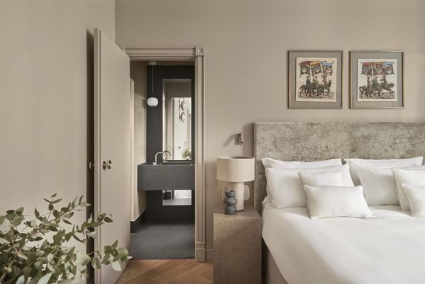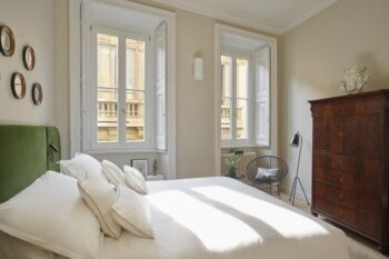 Pas plus de six chambres sont réparties sur deux étages. Le deuxième étage en compte quatre tandis que les deux dernières se trouvent à l’étage inférieur. Chaque chambre est unique.  Décorées avec élégance, par exemple la chambre Borgospesso présente un coffre en acajou du XIXe siècle, une lampe trépied d’inspiration vintage et une chaise Acapulco en corde de polyvinyle tressée, tandis qu’une collection de portraits miniatures en émail est soigneusement disposée au-dessus d’une tête de lit capitonnée.