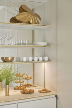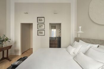 Crossing Manzoni occupe deux étages d’un palais néoclassique où résident depuis longtemps d’éminentes familles. Propriété d’Alfio et de son épouse Carlotta, l’établissement a été conçu autour d’une décoration épurée au design contemporain. Ici, place à un mélange d’œuvres d’art et d’objets insolites que les propriétaires ont chinés chez des antiquaires, dans des marchés et showrooms de design à travers l’Italie et au-delà. L’hôte n’est pas surpris de voir une applique murale des années 1950 côtoyant une remarquable sculpture de cerf en treillis métallique blanc ; quelques figurines en laiton réalisées à la main, un portrait à l’huile du XIXe siècle. Si l’atmosphère est sophistiquée, elle offre une palette de tons doux : crème, gris et anthracite. L’établissement bénéficie d’un calme absolu, loin de l’agitation qui règne aux abords du Duomo.