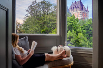 La construction du charmant hôtel Nomad remonte à 1876, plus de 15 ans avant que soit posée, à trois pas d’ici, la première pierre du Château Frontenac. Longtemps connu sous le nom de Château Fleur de Lys, l’hôtel s’est paré au printemps 2021 d’une nouvelle identité. Ici, dès qu’on pousse la porte tout respire le XIXe siècle. L’atmosphère feutrée rappelle le passé bourgeois de la demeure. Un fauteuil recouvert de velours rouge trône près de la réception, de vieilles valises empilées, des livres, un buste de caribou accueille les hôtes. Chaque élément a été choisi avec soin et le confort, lui, est bien du XXIe siècle.