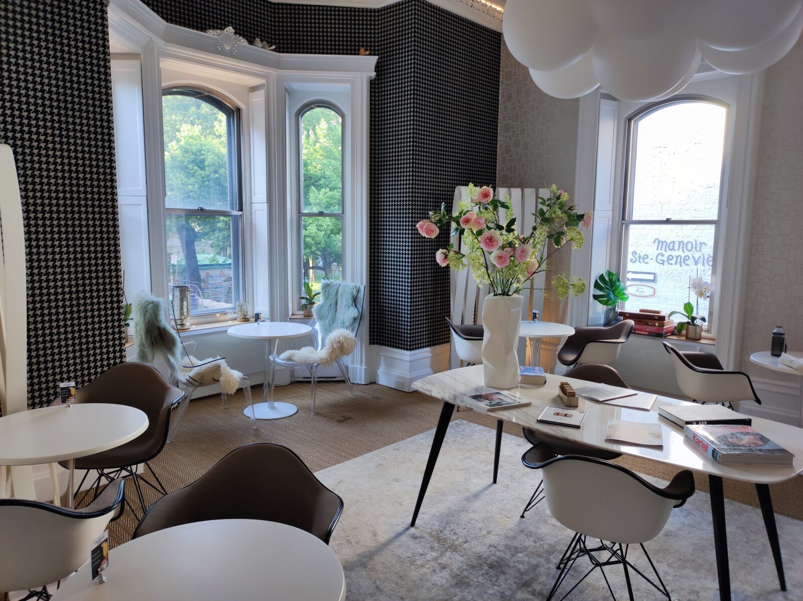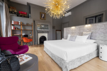 Le renouveau de l’établissement, on le doit à Olivier Donzelot et à Romuald Georgeon qui ont fait l’acquisition de l’ancien Château Fleur de Lys à la fin de 2013, là où, en 1876, Florence Adélaïde Allan White, alors la fille de l’homme le plus riche du Canada, avait pris ses quartiers. Le couple franco-suisse a pris le temps de créer une adresse originale faite d’univers distincts et d’atmosphères qu’il y a de chambres. 16 chambres dont 6 suites – chacune  raconte une histoire au fil des souvenirs et des objets chinés par les propriétaires, mais aussi des meubles et des luminaires signés par de grandes maisons de Kartell, Eames, Starck, Herman Miller, Vitra, Artemide, Pablo Designs ou fabriqués sur mesure par des artisans québécois.