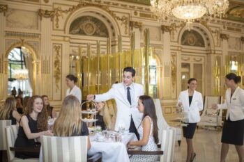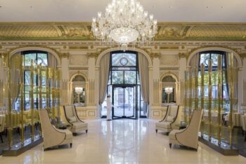 Depuis son ouverture en août 2014, le Peninsula Paris installé dans les murs de l’ancien Hôtel Majestic (1907), ex-siège de l’Unesco après la Seconde Guerre mondiale, puis du Centre international de conférences où fut signée en 1973 la paix au Vietnam par Henry Kissinger ; joue la carte du luxe, sans lésiner sur la profusion des marbres, l’espace, les mosaïques, les boiseries, le feuilletage d’or –le lustre de l’entrée principale soufflé à la main est composé d’une cascade de 800 «feuilles» de cristal. Les dorures sont partout. La gigantesque façade sur l’avenue Kléber de 10.000 mètres carrés a mobilisé vingt tailleurs de pierres spécialisés dans la restauration de monuments historiques. Ils ont réhabilités bas-reliefs, fleurs, nœuds, rubans sculptés… pour une rénovation à l’identique.