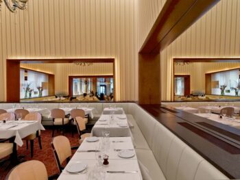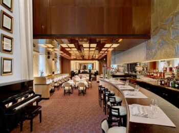On vient au Relais Plaza se détendre, se régaler… tout simplement pour goûter à l’art de vivre parisien depuis 1936. Le Relais Plaza, Haut-lieu de la mode, du monde des affaires et des spectacles est depuis longtemps une adresse incontournable et unique à Paris. Ce bistrot Art Déco de l’hôtel, inscrit à l’inventaire supplémentaire des monuments historiques, a profité d’un rafraîchissement orchestré par Bruno Moinard, qui s’est attelé à repenser les éléments de décoration et le mobilier tout en préservant son âme et son histoire. Tout comme le comptoir du bar, désormais plus large, où il est possible de se faire servir ou encore le spectaculaire abat-jour en staff plissé. On vous reçoit dans une réplique de la salle à manger du paquebot Normandie, qui a su conserver l’esprit des années folles.