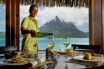 Le resort possède qautre bars et restaurants. Les gourmets sont chouchoutés, on vit des moments de découvertes culinaires. Les repas sont délicieux et inoubliables. Le Restaurant Sushi Take vous initie à “l’art du sushi” dans un cadre zen et distrayant. Outre les succulents sushis, goûtez aux fruits de mer et aux plats de la gastronomie japonaise accompagnés de saké. Le restaurant “Signature” du Resort, The Lagoon by Jean Georges suspendu au-dessus des flots, offre une vue splendide sur le Mont Otemanu. Sa carte allie avec originalité saveurs asiatiques et locales avec un menu spécialement concocté par Jean Georges Vongerichten. Place à l’expérience gastronomique la plus raffinée de la Polynésie française. Détente et plaisir sont assurés au Te Pahu, avec ses grillades et d’autres plats savoureux comme le thon grillé aux herbes fraiches, l’espadon confit à l’huile d’olive, le filet d’agneau rôti aux olives noires, le filet de bœuf Kobe ou le ceviche aux crevettes et aux agrumes. Prochainement, un restaurant italien viendra compléter l’offre gastronomique. Pas de doute, le St regis Bora Bora Resort également réputé pour les cérémonies de mariage à la polynésienne propose à ses hôtes le nec plus ultra pour un séjour de rêve où détente et relaxation sont les maîtres mots. Une adresse incontournable si vous passez pas Bora Bora !