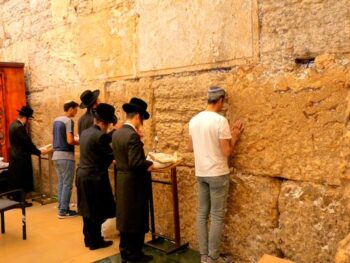 Au plus près du mur, la ferveur est très sensible. Les femmes coiffées de leur foulard, confie au mur leur prière, leur foi et leurs espérances. Toucher le mur est un acte fort. Des petits papiers contenant remerciements, prières et souhaits sont insérés dans les failles, comme autant de reliques qui seront ensuite confiés à la terre. Le lieu est très chargé en émotion. Et pourtant, on peut penser que le mur porte assez mal son nom (sauf si on tient compte de son étymologie britannique qui l’aurait traduit d’un mot arabe) car l’ambiance y est festive, surtout si vous tombez un jour de bar mitzvah (le lundi et le jeudi) et son cortège musical. Une foule cosmopolite, colorée, mélange de touristes et de croyants s’entrecroise, saisie d’une ferveur communicative.