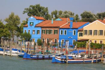 Après votre escale nocturne, prenez le “chemin” vers le nord et les îles romantiques. Tout d’abord, cap sur l’île de San Erasmo, connue aussi sous le nom populaire de jardin-potager de Venise. La Torre Massimiliano, une fortification historique témoigne de l’important système défensif de la République Vénitienne. Puis, votre regard sera attiré par San Francisco del Deserto, solitaire et intrigante, avec ses centaines de cyprès qui gardent le monastère où en 1220 s’est arrêté Saint François d’Assise revenant d’Orient. Un bel ensemble de cloîtres, chapelles et jardins immortalisés par Corto Maltese s’y niche. Tandis qu’à tribord, de curieux rameurs qui dirigent leurs barques en ramant ” à la valesane ” vous saluent amicalement, votre Pénichette vous conduit à Burano, un bourg de pêcheurs que l’on dirait né de la palette d’un peintre génial, avec ses maisons insolites colorées qui se reflètent dans les minuscules canaux. Accostez et parcourez, de préférence le matin, les pâtisseries, les boutiques de dentelles, et flânez le long des façades aux teintes abricot, cerise, myrtille, citron, orange ou encore pomme verte. Non loin se dévoile, l’île de Torcello connue pour son patrimoine architectural. Elle abrite : une basilique, une église et un musée. Torcello, fondée en 639 possède la première église qui fut construite dans la lagune, au neuvième siècle : la cathédrale Santa Maria Assunta, dont la mosaïque byzantine du Jugement dernier, d’or et de bleu, s’élève au-dessus de l’entrée.