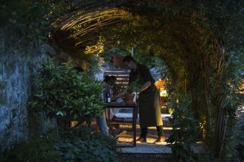 On y accède par un escalier dédié, qui s’ouvre à l’entrée du parking du Clos des Sens. Le Cortil se situe en pleine nature, une centaine de mètres en contrebas de sa Maison mère. Autour d’une cuisine à la flamme, Le Cortil a repris du service depuis le 28 mai. Il propose une carte de planches et de plats à partager, revisitant dans les grandes lignes du concept des planches apéritives.