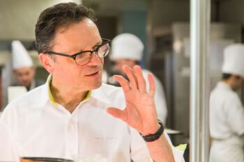 Patrick Bertron, est aujourd’hui, le chef du Relais Bernard Loiseau. Après des études à l’école hôtelière de Saint-Nazaire, il a fait ses premiers pas en 1982 au sein de la brigade de Bernard Loiseau, qui venait d’obtenir deux étoiles au Guide Michelin. Il occupe la fonction de commis en pâtisserie, puis passe commis aux légumes et aux viandes. Il accède ensuite au poste de second. En 1991, il participe à la conquête de la troisième étoile. Patrick Bertron offre une cuisine authentique, précise et inventive. Il réinvente donc un héritage gastronomique avec un talent confirmé, et a réussi à conserver les trois étoiles, acquises par Bernard Loiseau en 1991, durant 13 années. On retrouve dans sa carte l’exigence et l’imagination forgées par plus de 20 ans de collaboration avec le Chef Loiseau. Il indique : « Ma cuisine est une cuisine de terroir, à forte identité française… j’aime souligner le produit phare de l’assiette, avec une épice par exemple, mais toujours de façon naturelle et très bien dosée. Une cuisine gourmande, franche, avec des attentions, des subtilités, des surprises… ». Toute l’existence de Patrick Bertron s’inscrit entre deux horizons : son amour métissé pour une mer natale et un terroir d’adoption. Sa cuisine est ainsi la rencontre de deux univers, bruts et sauvages. La nature marine et indomptée des côtes bretonnes, la puissance tellurique et secrète des forêts du Morvan. Il respecte le produit, avec la volonté de le rendre exceptionnel.