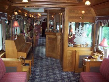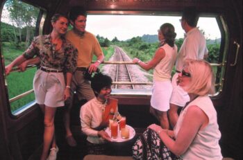 16h, Gare de Hua Lamphong à Bangkok. Vingt-deux voitures habillées d’une livrée vert anglais et beige patientent sur le quai numéro 3. On ressent d’emblée le parfum qui caractérise les gares ferroviaires de Thaïlande. A peine, votre précieux sésame sorti de la poche : votre billet, et un porteur s’empare des bagages avec des gestes délicats. Il les conduit vers un train d’allure très ancienne. Devant ces voitures étincelantes, pas moins de quarante membres d’équipage sont alignés en uniforme. Ils joignent les mains en se penchant pour saluer les passagers qui approchent. Une ravissante hôtesse ondulant dans son sarong de soie rouge dirige les hôtes vers la voiture salon. On admire alors les boiseries et les bouquets de fleurs disposés sur les tables, devant des vitres protégées de voilettes, les tissus précieux, la moquette à dessins orientaux… Ambiance orientale et coloniale garantie.