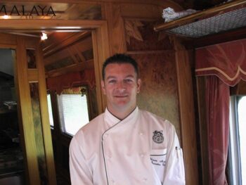 Yannis Martineau, jovial, attentif à tout, amoureux de l’Asie nous convie à une balade gastronomique. Superviser, créer de nouveaux mets régulièrement dans les cuisines de l’Eastern & Oriental Express, c’est un peu une vocation pour lui. Dans les assiettes se succèdent : saumon fumé avec salade à la papaye verte, médaillon d’agneau avec son jus épicé et fricassée de légumes, Saint-Jacques et velouté de champignons et, en guise de dessert, pudding au chocolat et glace noix de coco. De subtiles alchimies… pour régaler les palais de tous. Alors qu’un café de Colombie vient tout juste d’être servi accompagné, comme il se doit de petites douceurs, le train circule à proximité de Kuala Lumpur, capitale de la Malaisie, d’où se détachent dans la nuit les tours jumelles géantes de la société pétrolière “Pétronas”. Avant de rejoindre son compartiment, la plupart des passagers se retrouvent soit au bar ou sur la plateforme extérieure pour prolonger les conversations nouées pendant le dîner. On y rencontre également de jeunes amoureux en tenue de soirée qui se tiennent enlacés sur cette même plateforme tandis que le train frôle les plantations d’hévéas, les étangs et les rizières. Le train tangue, cahute…