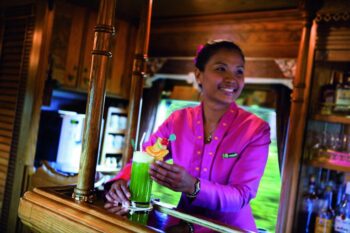 Après cette excursion, chacun retrouve avec bonheur l’ambiance feutrée de l’E&O et son personnel thaïlandais, malais, singapourien, européen toujours prêt à satisfaire nos envies, exigences et parfois caprices. L’après midi touche à sa fin, le soleil éclaire de ses derniers rayons la voiture observatoire et vient mourir sur le plancher en teck. Un barman fait tinter les glaçons dans son shaker, tout près le pianiste égrène des airs de Sinatra, Gershwin, Piaf, Elton John, Liza Minelli… pendant que les couples se désaltèrent autour d’un verre du fameux cocktail Singapore sling. L’heure du dîner approche. Les élégantes voitures restaurant Malaysia et Singapura accueillent, les femmes en robes longues et les hommes en smoking. Les tables sont dressées. Elles sont habillées de nappes blanches amidonnées sur lesquelles on a disposé l’argenterie et la verrerie en cristal. Chaque voyageur prend place délicatement dans de moelleux fauteuils en prenant soin de saluer son voisin. L’ambiance est plutôt conviviale. Le menu présenté par les serveurs à la prévenance proverbiale répond aux accents eurasiens. Tout est cuisiné à bord au sein de deux étroites cuisines sous la direction du chef français Yannis Martineau, Vendéen d’origine, qui a passé quatre années aux côtés du chef Christian Bodiguel sur le Venise Simplon-Orient-Express avant d’orchestrer les cuisines du “Road to Mandalay”, le seul bateau de la collection Orient-Express, en Birmanie.