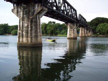 Le jour s’est levé depuis bien longtemps, il est à peine 7 heures et le train traverse peu après Wang Po, le pont de la rivière Kwai. Là même où durant la seconde guerre mondiale, les japonais avaient mobilisé 30 000 prisonniers anglo-saxons pour son édification. La plupart y laissèrent la vie. Initialement construit en bambous, plusieurs fois bombardé, le pont a été rebâti en dur. Un pont porté par de larges piliers de béton. Le train s’immobilise. C’est un peu le temps du recueillement… Des milliers d’hommes sont morts pour cet ouvrage succombant à la faim et la malaria durant les travaux ou utilisés comme boucliers humains lors des raids de l’aviation britannique. Seuls souvenirs de cet épisode tragique, un cimetière militaire et un petit musée qui reconstitue les conditions de vie des prisonniers.