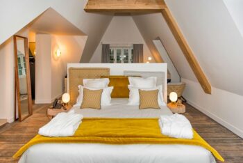 Au Jardins de Coppelia, c’est une jeune équipe, originaire de la région, à la fois discrète et à l’écoute de chacun qui veille à votre bien-être. Atout supplémentaire, elle connait particulièrement bien les attraits touristiques du Pays d’Auge. Dans le manoir, place à de grandes fenêtres avec vue panoramique sur le parc comprenant 7 hectares de vergers. Une immense cheminée trône dans le salon, côté mobilier, on apprécie les fauteuils crapauds, canapés en velours signés Roche Bobois. Une mezzanine est habillée d’emblématiques canapés Mah Jong. Un partenariat inédit a été engagé avec la marque d’ameublement afin de renouveler une partie du mobilier.