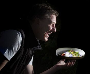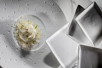 Eric Prowalski propose une cuisine savoureuse au sein de la belle Rotonde panoramique des Trésoms. Pour mettre en valeur ses talents, Sarah Lavoine a signé le récent réaménagement de la salle. On trouve sur la table de précieux couverts “Zermatt” dessinés par Patrick Juin pour Puiforcat et le couteau des Alpes en genévrier conçu par un artisan d’art local. En prenant place, on est d’emblée séduit par les créations du Chef. Il interprète finement les deux territoires qui ont forgé sa vie : la Côte d’Argent, du bassin d’Arcachon où il est né et le lac d’Annecy, terre d’adoption qu’il a choisie pour vous partager sa sensibilité.