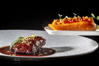 Privilégiant les circuits courts et les producteurs locaux de Savoie, avec des clins d’œil aux origines du Chef naviguant entre l’horizontalité de l’Aquitaine et la verticalité des Alpes – deux destinations naturelles au culturelles aussi puissantes que complémentaires- Le résultat est d’une qualité de cuisine incontestable. Côté menus, La Terre des Alpes se compose de la Féra du lac mi-cuite, beurre d’Agastache et piquillos, de la Truite lacustre étuvée, agaric en feuille à feuille et jus perlé et d’un dessert nommé “Riz au lait de mon enfanc”e – très original et très réussi. Le menu Alchimie propose la Mousseline de pommes de terre, senteur des sous-bois et jus de poulet réduit, le Brochet étuvé aux algues marines, salicornes, coques et soupe de poisson du bassin d’Arcachon ou le Suprême de pigeon rôti, mousseline de petit pois et tartare d’huitre, l’Abondance en légèreté et noisettes torréfiées et le Chocolat en crémeux, céleri et basilic. Un accord mets-vins, selon l’inspiration du sommelier, peut-être envisagé.