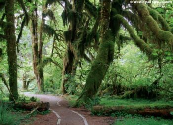 Composé de pins plusieurs fois centenaires à l’image de Hoh rain forest, le plus haut dépasse les 90 mètres, le plus vieux 600 ans quant au diamètre il peut atteindre 7 mètres. Les arbres sont recouverts de fougères, de lichens et de mousses qui pendent en touffes aux branches… Telles des éponges, les mousses et lichens d’un seul arbre peuvent absorber plus d’une tonne de d’eau de pluie. Une route panoramique “Olympic Peninsula Drive” longe le littoral et permet d’accéder aux plages. Cette zone est jonchée de troncs d’arbres échoués au hasard des tempêtes. La mer y a sculpté des aiguilles, des rochers, des îles habitées par des oiseaux et des mammifères marins à l’image de Ruby Beach. Au nord de la péninsule, Port Angeles est la plus grande agglomération du secteur. Son port assure des liaisons vers la ville de Victoria, capitale de l’Île de Vancouver au Canada.